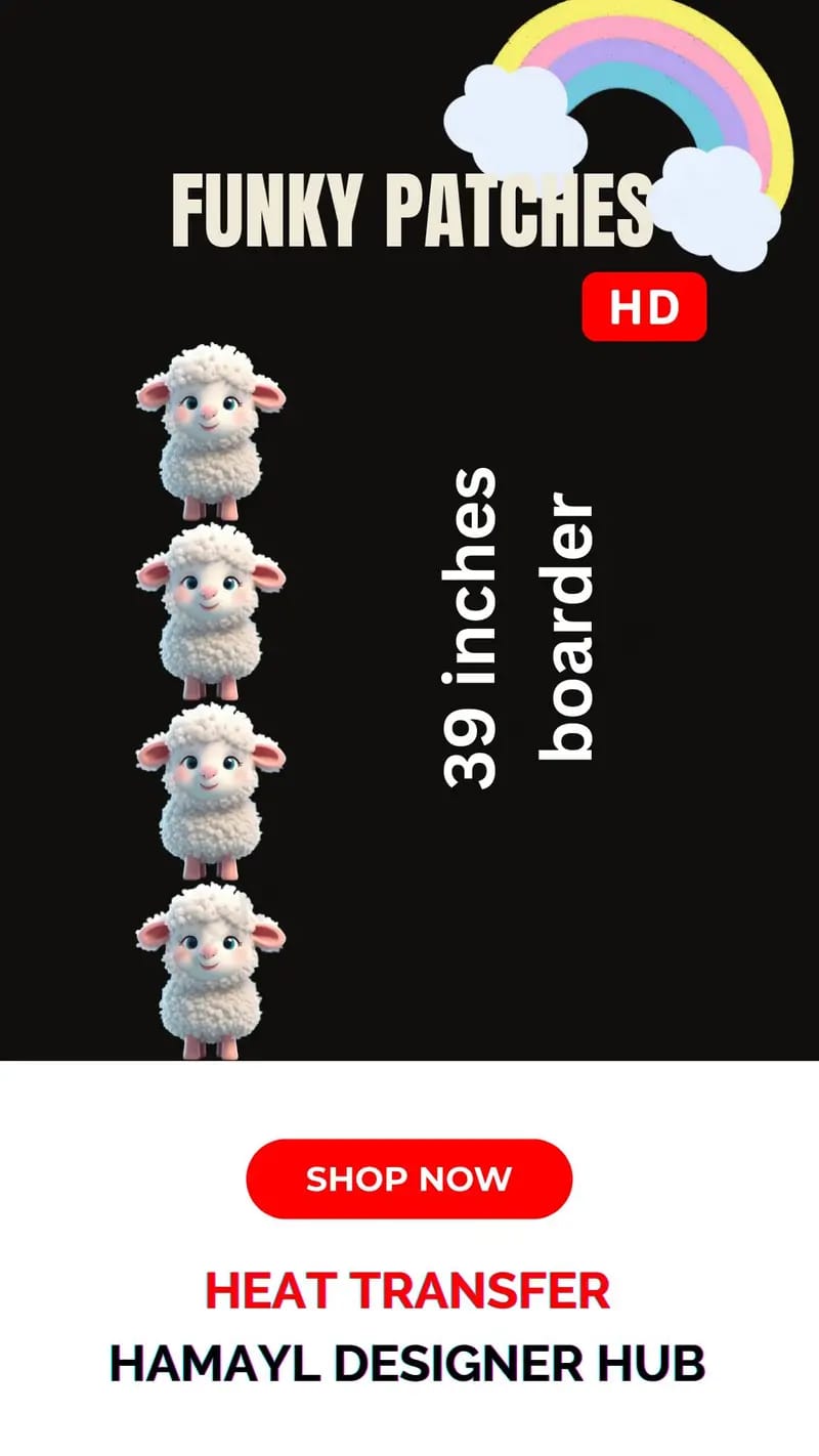 39 Inch Lamb Border Heat Transfer Patch is a premium decorative border design created for kids dresses, frocks, shirts, sleeves, and stylish clothing customization. This beautiful long border features repeating fluffy lamb motifs in a neat vertical arrangement, making it a perfect choice for adorable animal-themed fashion in Pakistan.Why Choose 39 Inch Lamb Border Heat Transfer Patch?