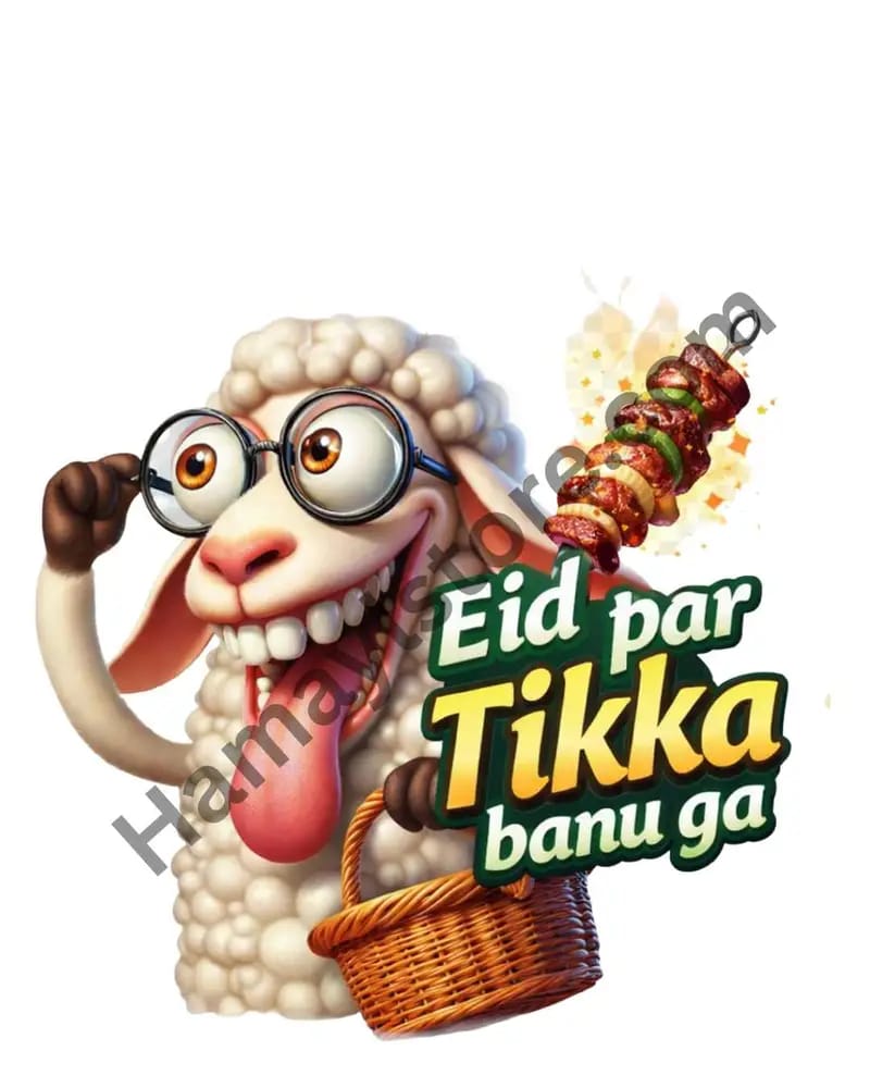 Eid ul Adha Iron On Patch is a premium funny heat transfer design created for Bakra Eid outfits, festive shirts, and creative kids clothing. This playful design features a cheerful sheep with glasses, a comic expression, and the humorous Urdu phrase Eid par Tikka banu ga, making it a standout choice for Eid ul Adha clothing customization in Pakistan.Why Choose This Eid ul Adha Iron On Patch?