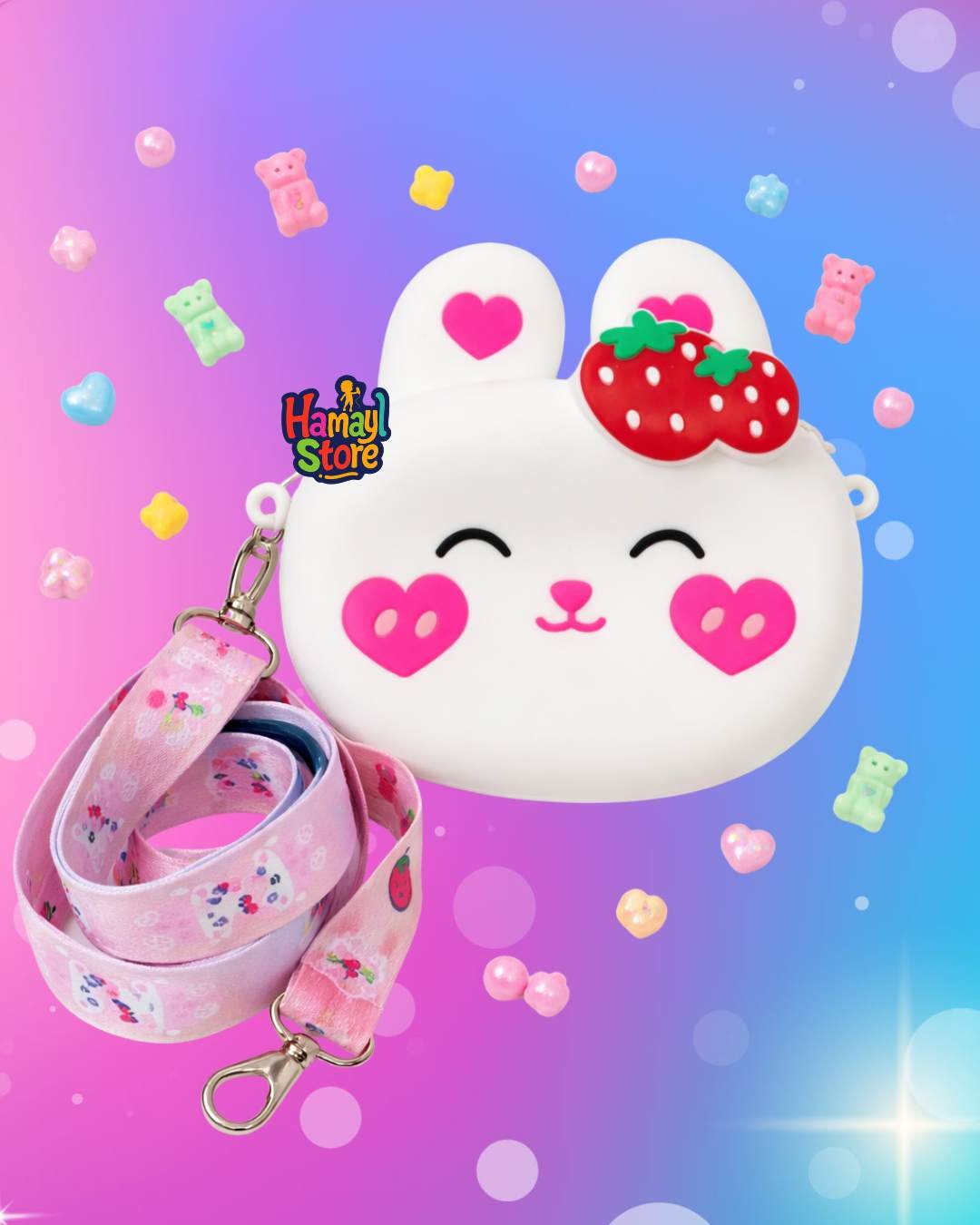 Kids silicone bag in Pakistan is one of the most trending accessories for girls in 2026, and this Strawberry Bunny Cute Crossbody bag is a perfect combination of adorable design and premium durability. Designed with a charming bunny face and strawberry detail, this bag is ideal for school, birthday parties, Eid celebrations and daily casual wear.